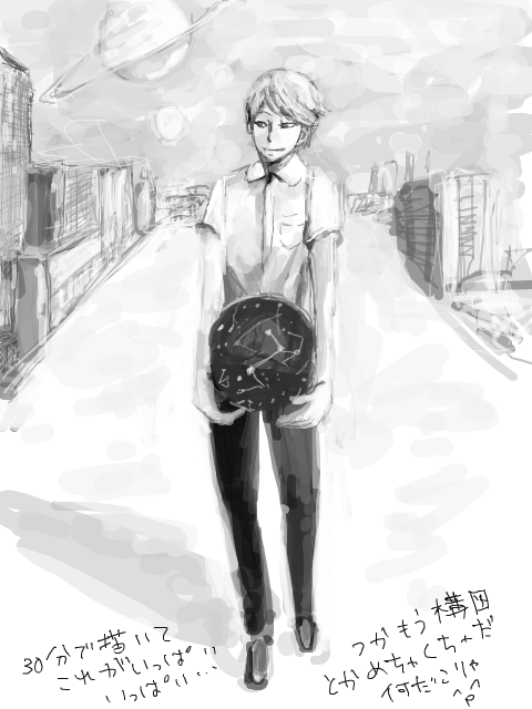 この絵も一体なんなのか…。なんか銀河鉄道の夜みたいな違う星の子っぽい。天球儀がなんか透き通った球体だからこの星は天文学だけ異様に発達してるとか後から色々考えてた。